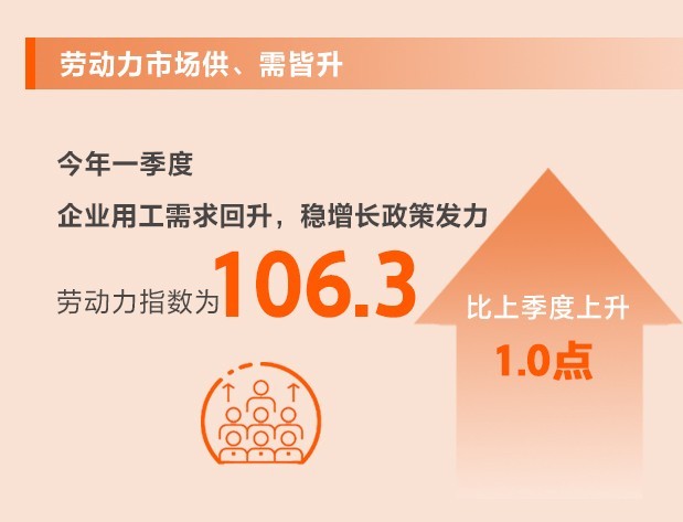 隨著生產(chǎn)生活秩序的恢復(fù),人員流動性的提高,企業(yè)用工需求開始回升,同時(shí)穩(wěn)增長政策持續(xù)發(fā)力,從業(yè)人數(shù)有所上升。一季度,勞動力指數(shù)為106.3,比上季度上升1.0點(diǎn)。其中,供應(yīng)指數(shù)為113.6,比上季度上升0.1點(diǎn);需求指數(shù)為98.9,比上季度上升1.9點(diǎn)。