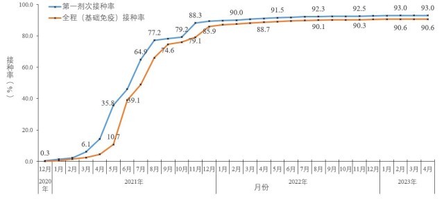 截至2023年4月20日,31個省(自治區(qū)、直轄市)和新疆生產(chǎn)建設(shè)兵團累計報告接種新冠病毒疫苗349443.2萬劑次(圖5-1)。接種總?cè)藬?shù)131048.0萬人,完成全程接種127708.4萬人,完成第一劑次加強免疫接種82783.9萬人。全人群第一劑次、全程接種覆蓋比例分別達(dá)到93.0%和90.6%(圖5-2)。60歲以上老年人累計報告接種新冠病毒疫苗68083.7萬劑次,接種總?cè)藬?shù)24169.3萬人,完成全程接種23036.1萬人,完成第一劑次加強免疫接種19318.9萬人。