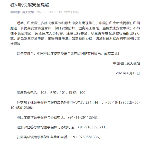 央視網(wǎng)消息:中國(guó)駐印度大使館官微6月19日發(fā)布安全提醒,內(nèi)容如下: