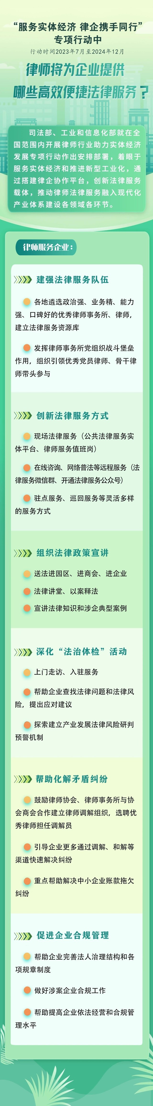 日前,司法部、工業(yè)和信息化部聯(lián)合印發(fā)《“服務(wù)實(shí)體經(jīng)濟(jì) 律企攜手同行”專(zhuān)項(xiàng)行動(dòng)方案》,就在全國(guó)范圍內(nèi)開(kāi)展律師行業(yè)助力實(shí)體經(jīng)濟(jì)發(fā)展專(zhuān)項(xiàng)行動(dòng)作出安排部署。