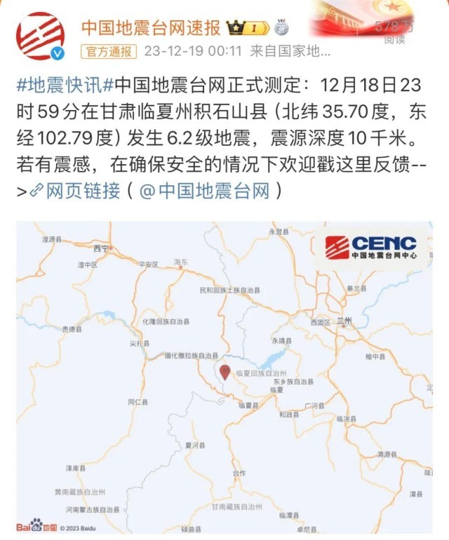 12月18日23時(shí)59分,甘肅臨夏州積石山縣發(fā)生6.2級(jí)地震,震源深度10公里,距離最近高鐵線(xiàn)路近60公里,甘肅多地震感明顯。