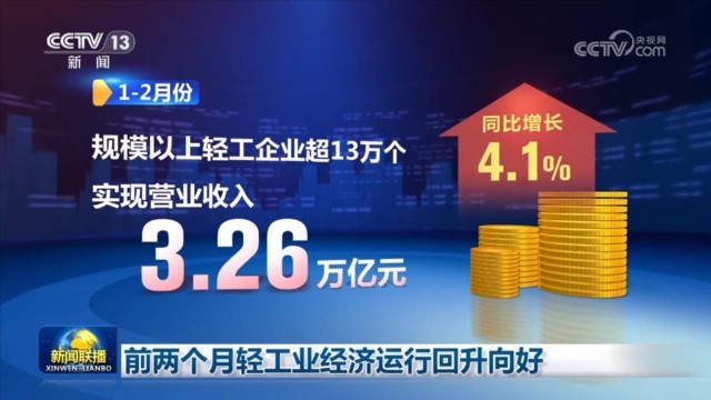 央視網(wǎng)消息(新聞聯(lián)播):中國輕工業(yè)聯(lián)合會發(fā)布數(shù)據(jù)顯示,今年前兩個(gè)月,消費(fèi)品制造業(yè)發(fā)展動(dòng)力增強(qiáng),帶動(dòng)輕工業(yè)經(jīng)濟(jì)運(yùn)行回升向好。1—2月,規(guī)模以上輕工企業(yè)超13萬個(gè),實(shí)現(xiàn)營業(yè)收入3.26萬億元,同比增長4.1%。