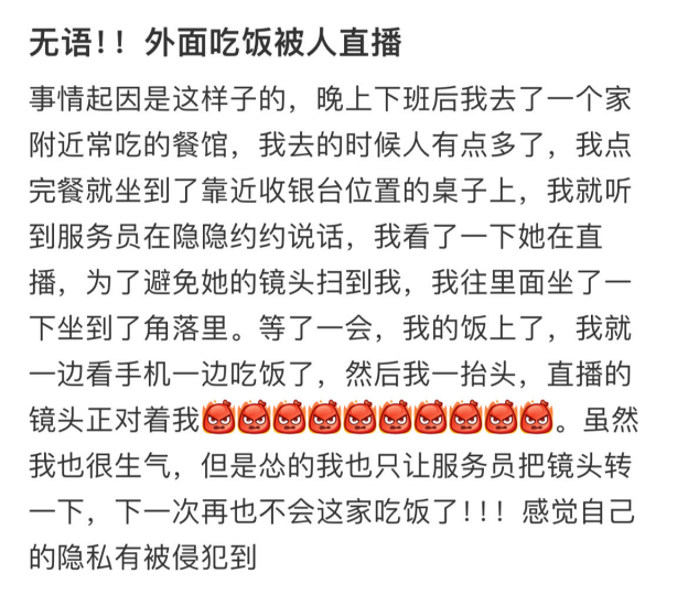 據(jù)媒體報(bào)道,近期,陜西西安兩名老人用餐時(shí)被商家拍下視頻,之后商家又私自將拍攝內(nèi)容發(fā)到網(wǎng)上,老人親戚無(wú)意刷到視頻才發(fā)現(xiàn)。在老人家屬與其多次溝通后,商家刪除了視頻。消費(fèi)者多在不知情或者未被征詢(xún)意見(jiàn)的情況下被動(dòng)充當(dāng)商家直播或者拍攝短視頻的引流工具,除了自己的言行舉止可能被迫接受他人的凝視和審判外,還有面部信息泄露風(fēng)險(xiǎn)。