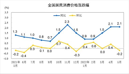 據(jù)國家統(tǒng)計(jì)局城市司高級(jí)統(tǒng)計(jì)師董莉娟介紹,從同比看,5月份CPI上漲2.1%,漲幅與上月相同。其中,食品價(jià)格上漲2.3%,漲幅比上月擴(kuò)大0.4個(gè)百分點(diǎn),影響CPI上漲約0.42個(gè)百分點(diǎn)。