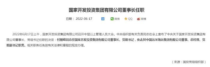 中新財經(jīng)6月17日電 國家開發(fā)投資集團有限公司網(wǎng)站6月17日消息,2022年6月17日上午,國家開發(fā)投資集團有限公司召開中層以上管理人員大會。中央組織部有關負責同志在會上宣布了中央關于國家開發(fā)投資集團有限公司董事長、黨組書記任職的決定:付剛峰同志任國家開發(fā)投資集團有限公司董事長、黨組書記,免去其中國遠洋海運集團有限公司董事、總經(jīng)理、黨組副書記職務。相關職務任免按有關法律和章程的規(guī)定辦理。(完)