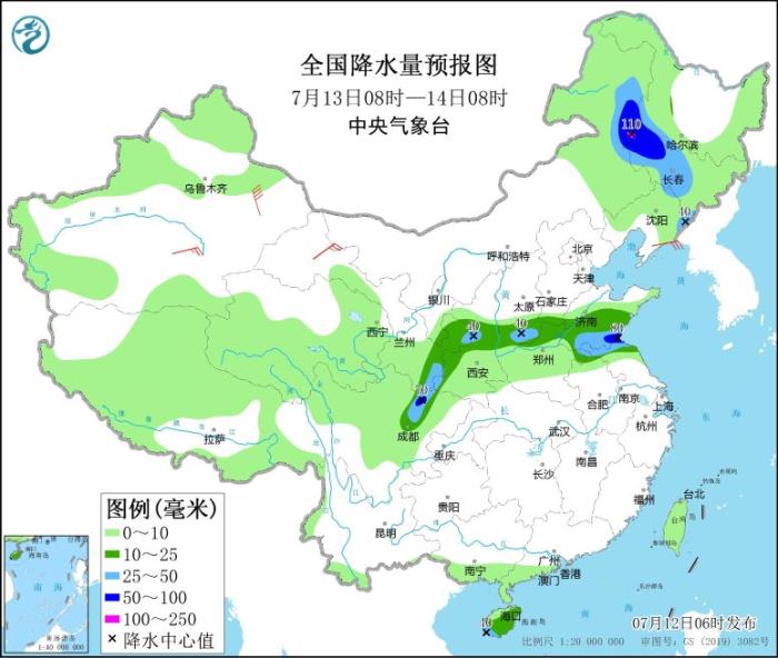 7月13日08時(shí)至14日08時(shí),內(nèi)蒙古東部、黑龍江西南部、吉林、遼寧東北部、甘肅東南部、陜西中部和西南部、山西南部、河南北部、河北南部、山東中南部、四川盆地西北部、海南島等地部分地區(qū)有中到大雨,其中,內(nèi)蒙古東北部、黑龍江西南部、吉林西部、山東南部等地部分地區(qū)有暴雨或大暴雨(100~110毫米)。新疆南疆盆地、甘肅河西等地部分地區(qū)有4~6級風(fēng)。