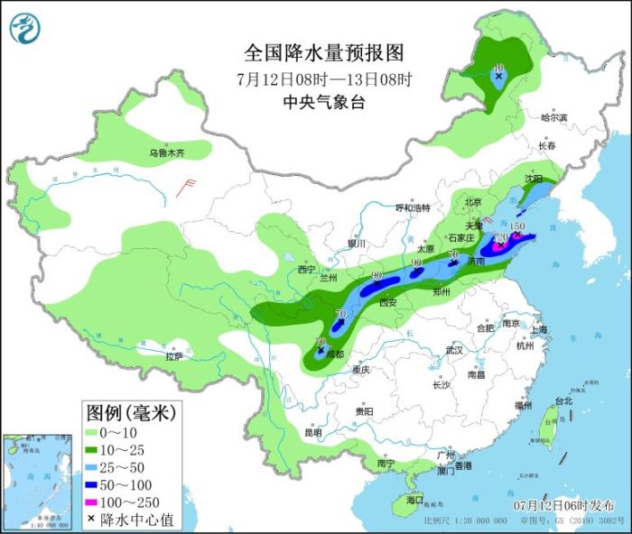 7月12日08時(shí)至13日08時(shí),甘肅東南部、陜西中部和西南部、山西南部、河北南部、河南北部、山東中北部、遼寧東南部以及四川盆地西北部等地部分地區(qū)有大到暴雨,其中,山東北部等地局部地區(qū)有大暴雨(100~150毫米)。