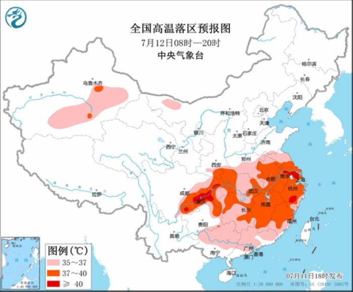 全國高溫落區(qū)預(yù)報(bào)圖(7月12日08時(shí)-20時(shí))