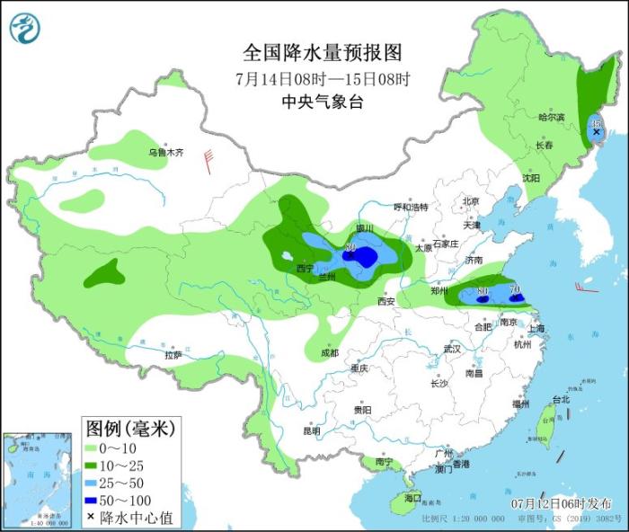 7月14日08時(shí)至15日08時(shí),內(nèi)蒙古西部、西北地區(qū)東部、河南東部、山東南部、安徽北部、江蘇中北部、黑龍江東部、吉林東北部等地部分地區(qū)有中到大雨,其中,甘肅東部、寧夏中部、陜西北部、安徽北部、江蘇中部等地部分地區(qū)有暴雨(50~80毫米)。新疆東部部分地區(qū)有6~7級風(fēng)。