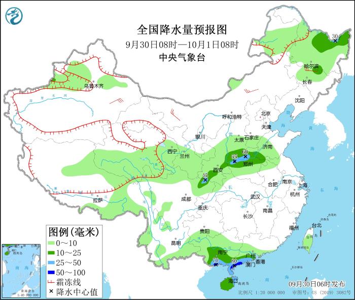 9月30日08時至10月1日08時,廣西南部、廣東西南部、海南島、四川東北部、陜西南部、山西南部、河南北部等地的部分地區(qū)有中到大雨,局地暴雨(50~70毫米);黑龍江、吉林北部、新疆沿天山地區(qū)、青藏高原中東部等地的部分地區(qū)有小到中雨。新疆東部、內(nèi)蒙古中西部、東北地區(qū)東部等地的部分地區(qū)有4~6級風(fēng),新疆東部部分地區(qū)有7~8級風(fēng)。