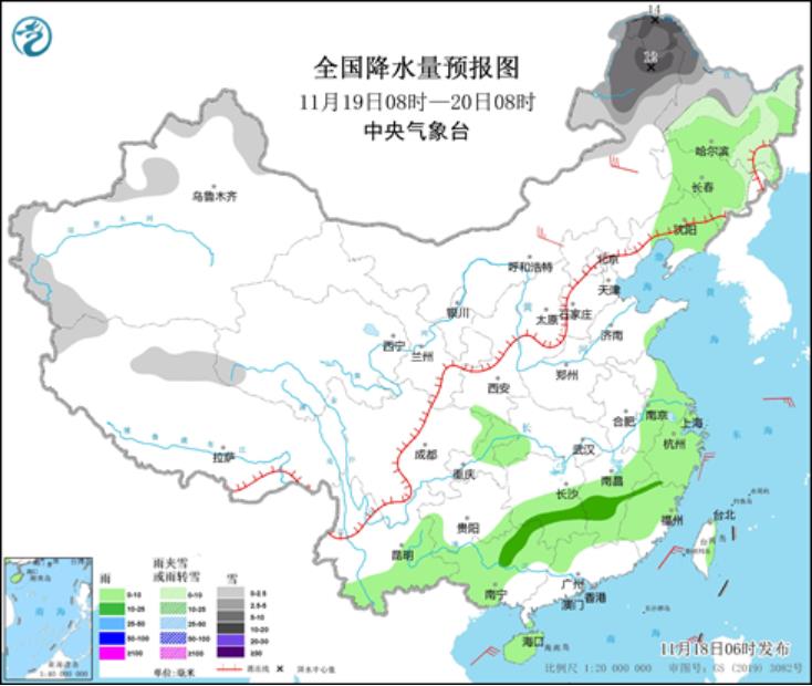 11月18日08時(shí)至19日08時(shí),內(nèi)蒙古中東部、黑龍江西部、河北北部等地部分地區(qū)有小到中雪或雨夾雪,其中,內(nèi)蒙古東北部部分地區(qū)有中到大雪(5~8毫米)。華北西部、黃淮、江淮、江漢、江南、西南地區(qū)東部、華南西部等地部分地區(qū)有小到中雨,其中,廣西西北部、湖南東部、江西中部、浙江南部等地部分地區(qū)有大雨。內(nèi)蒙古中部部分地區(qū)有5~6級(jí)風(fēng)(見圖2)。東海北部海域?qū)⒂?~7級(jí)、陣風(fēng)8級(jí)的偏東風(fēng)。