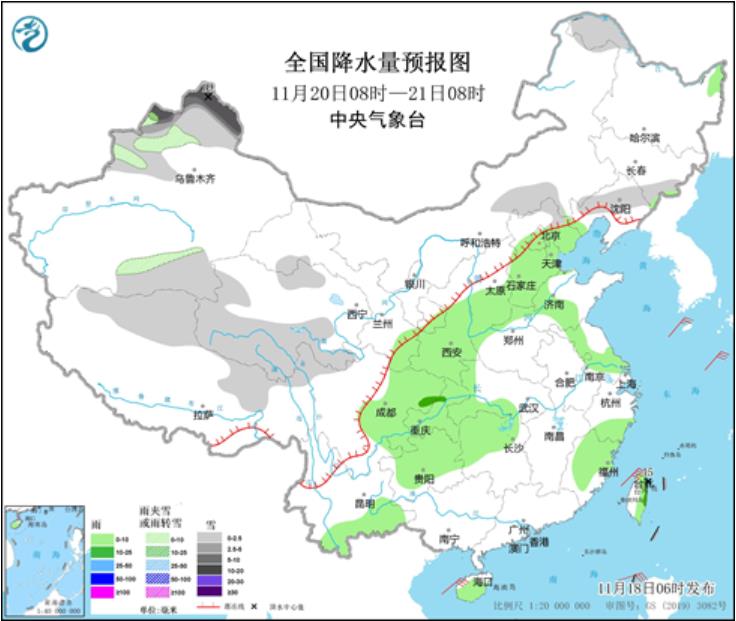 11月20日08時(shí)至21日08時(shí),新疆北疆和南部、西藏北部、青海南部和西部等地部分地區(qū)有小到中雪或雨夾雪,其中,新疆北疆有大到暴雪(10~19毫米)。東北地區(qū)大部、江南東部和南部、云南南部、華南西部、海南島等地部分地區(qū)有小到中雨。(見圖4)。