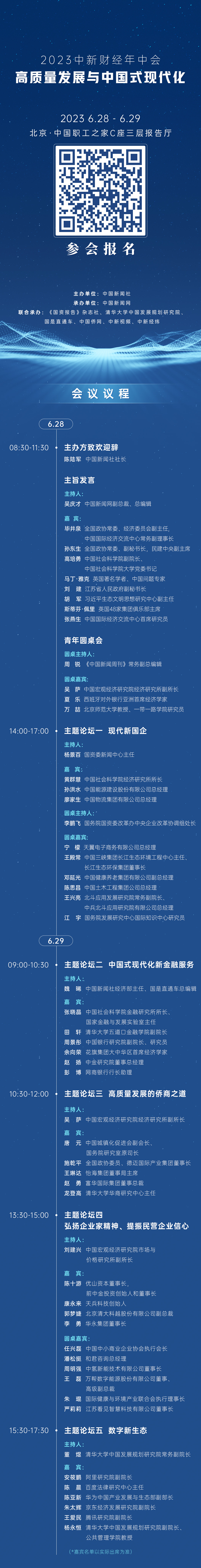 為宣傳貫徹落實(shí)黨的二十大精神和部署,以高質(zhì)量發(fā)展扎實(shí)推進(jìn)中國(guó)式現(xiàn)代化建設(shè),推動(dòng)全面建設(shè)社會(huì)主義現(xiàn)代化國(guó)家開好局起好步,中國(guó)新聞社擬于2023年6月28至29日在北京舉辦“2023中新財(cái)經(jīng)年中會(huì)”,主題為“高質(zhì)量發(fā)展與中國(guó)式現(xiàn)代化”。