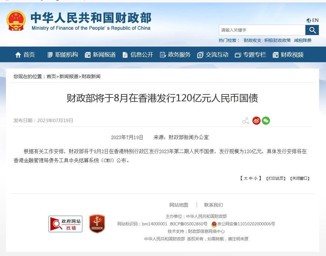 中新網(wǎng)7月19日電 據(jù)財政部網(wǎng)站19日消息,根據(jù)有關(guān)工作安排,財政部將于8月2日在香港特別行政區(qū)發(fā)行2023年第二期人民幣國債,發(fā)行規(guī)模為120億元,具體發(fā)行安排將在香港金融管理局債務(wù)工具中央結(jié)算系統(tǒng)(CMU)公布。
