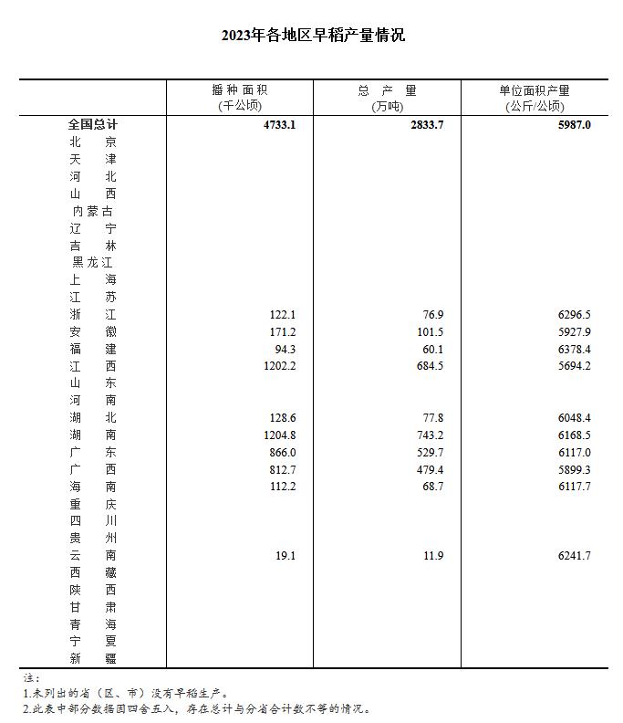 中新網(wǎng)8月23日電 國家統(tǒng)計(jì)局網(wǎng)站23日發(fā)布關(guān)于2023年早稻產(chǎn)量數(shù)據(jù)的公告。根據(jù)早稻抽樣調(diào)查結(jié)果推算,2023年全國早稻播種面積、單位面積產(chǎn)量、總產(chǎn)量如下: