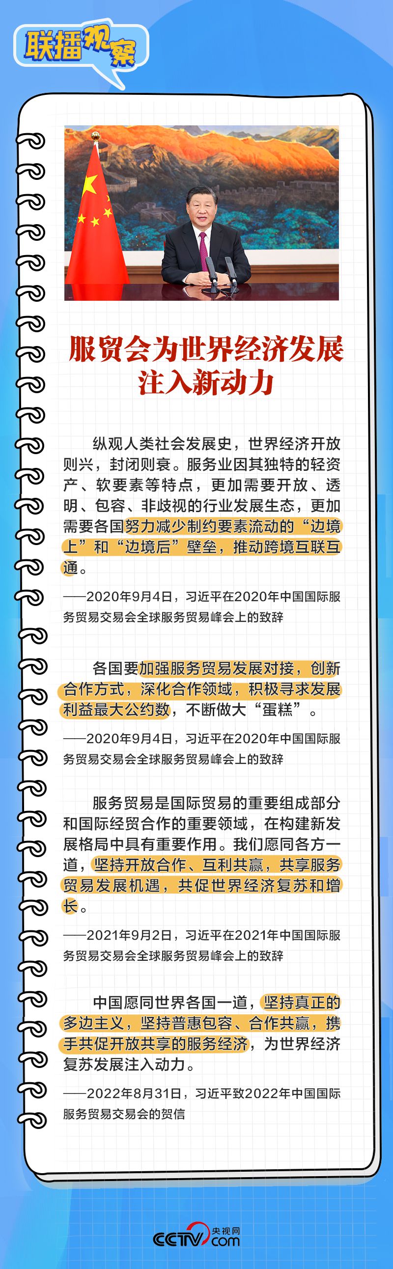 |聯(lián)播+|“當(dāng)前,百年變局加速演進(jìn),世界經(jīng)濟(jì)復(fù)蘇動(dòng)力不足。服務(wù)貿(mào)易是國(guó)際貿(mào)易的重要組成部分,服務(wù)業(yè)是國(guó)際經(jīng)貿(mào)合作的重要領(lǐng)域”。9月2日上午,習(xí)近平主席在北京向2023年中國(guó)國(guó)際服務(wù)貿(mào)易交易會(huì)全球服務(wù)貿(mào)易峰會(huì)發(fā)表視頻致辭。