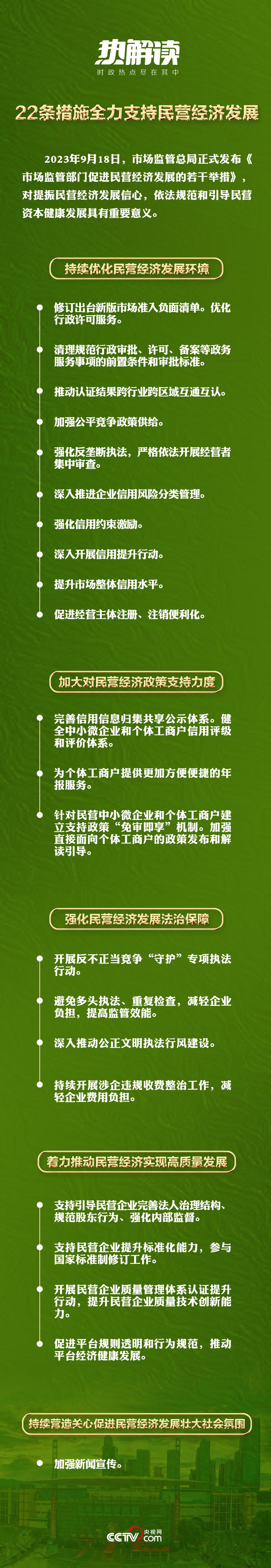 2023年7月14日,中共中央國(guó)務(wù)院出臺(tái)《關(guān)于促進(jìn)民營(yíng)經(jīng)濟(jì)發(fā)展壯大的意見》,對(duì)促進(jìn)民營(yíng)經(jīng)濟(jì)發(fā)展壯大作出新的重大部署。2023年9月18日,市場(chǎng)監(jiān)管總局發(fā)布《市場(chǎng)監(jiān)管部門促進(jìn)民營(yíng)經(jīng)濟(jì)發(fā)展的若干舉措》,通過22條措施為全力支持民營(yíng)經(jīng)濟(jì)發(fā)展設(shè)計(jì)了具體落實(shí)的“施工圖”。