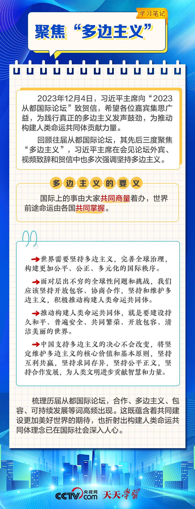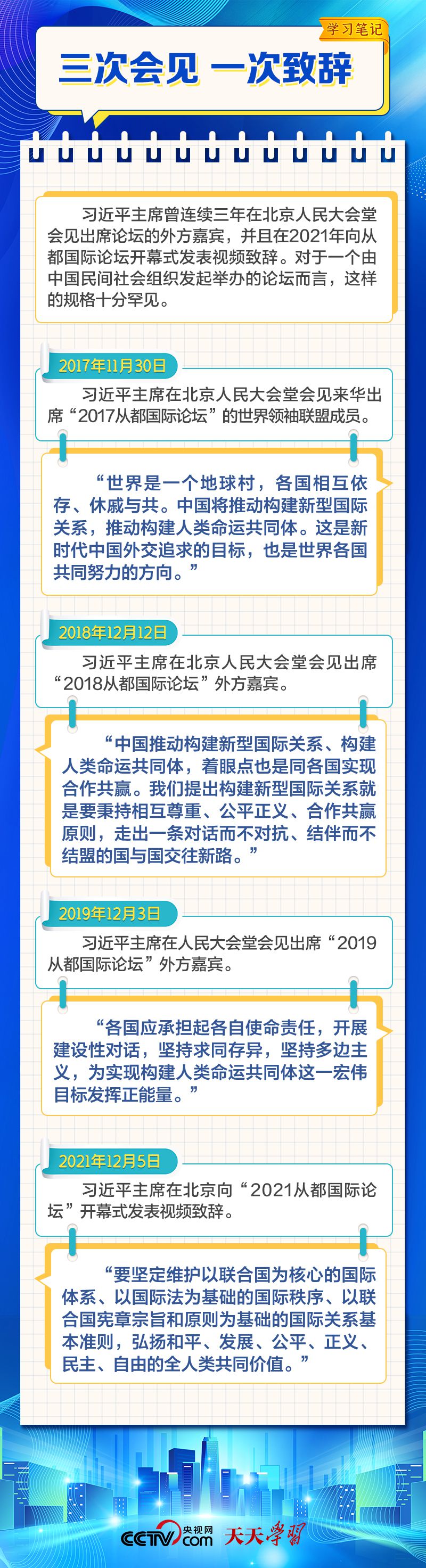 天天學(xué)習 12月4日,習近平主席在致“2023從都國際論壇”的賀信中強調(diào),面對前所未有的世界之變、時代之變和歷史之變,人類社會必須團結(jié)起來,堅持互學(xué)互鑒、開放包容、合作共贏,弘揚全人類共同價值,共同建設(shè)更加美好的世界。