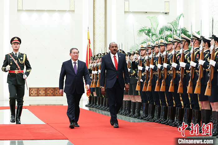 會(huì)談前,李強(qiáng)在人民大會(huì)堂北大廳為布朗舉行歡迎儀式。