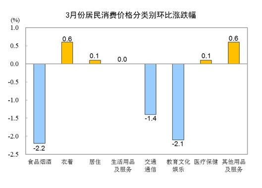 3月份,全國(guó)居民消費(fèi)價(jià)格環(huán)比下降1.0%。其中,城市下降1.0%,農(nóng)村下降0.7%;食品價(jià)格下降3.2%,非食品價(jià)格下降0.5%;消費(fèi)品價(jià)格下降0.9%,服務(wù)價(jià)格下降1.1%。