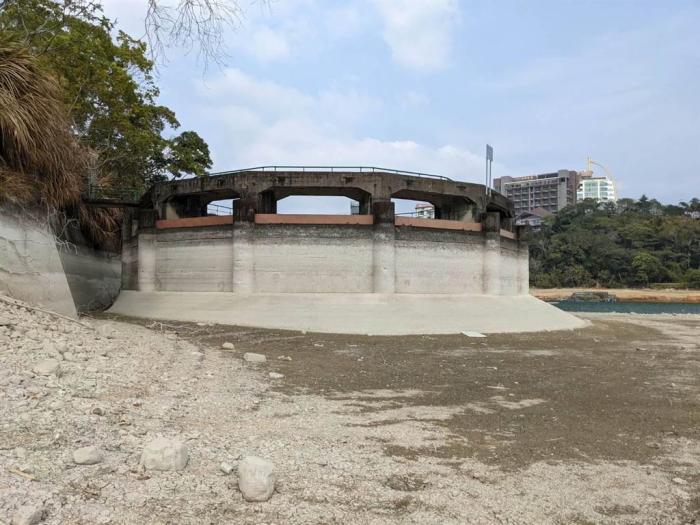 日月潭水位驟降7.4米,溢流井建筑體露出。圖片來源:臺灣中時新聞網(wǎng)