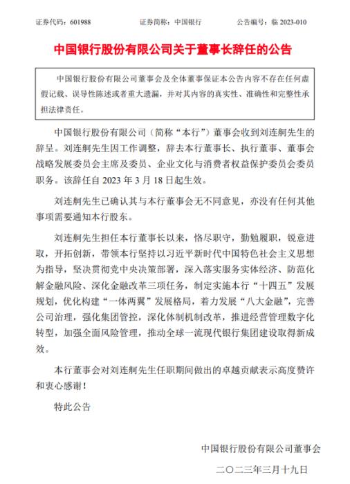 資料顯示,劉連舸生于1961年5月,曾任中國進出口銀行黨委副書記、副董事長、行長等職。2019年6月至2023年2月,出任中國銀行黨委書記、董事長,2023年2月至3月任中國銀行董事長。