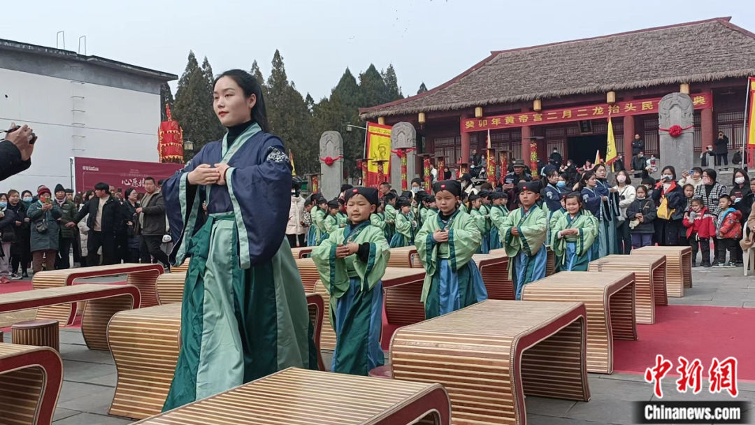 2023年2月,河南省鄭州新密市軒轅小學(xué)三十余名新生在黃帝宮參加開筆禮。司向東 攝