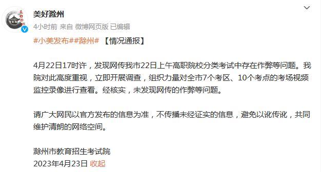 中新網(wǎng)4月23日電 據(jù)安徽省滁州市委宣傳部官方微博消息,滁州市教育招生考試院23日發(fā)布情況通報(bào)。通報(bào)稱,4月22日17時(shí)許,發(fā)現(xiàn)網(wǎng)傳滁州市22日上午高職院校分類考試中存在作弊等問(wèn)題。
