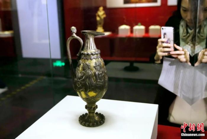 民眾在西安陜西歷史博物館參觀展出的波斯薩珊王朝胡瓶。張遠 攝