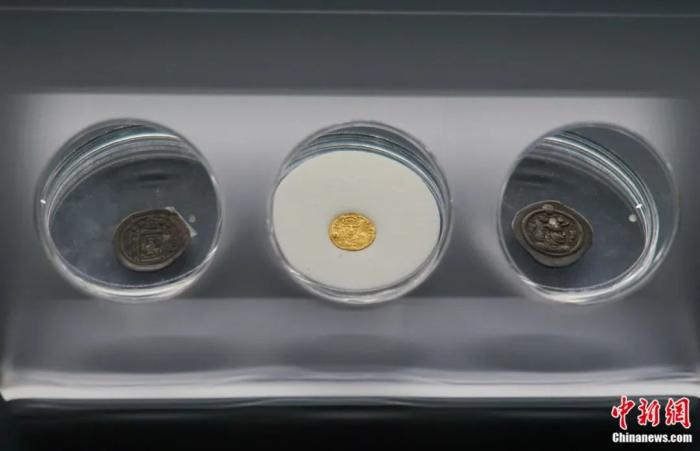 青海省博物館藏、南北朝時期的波斯薩珊朝銀幣(兩側 西寧隍廟街出土)和羅馬金幣(中 都蘭縣香日德出土)。中新社記者 馬銘言 攝