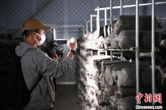 7月17日,甘肅省古浪縣,參加“絲路風(fēng)采 如意甘肅”聯(lián)合采訪活動的兩岸及香港記者在當(dāng)?shù)仞B(yǎng)菌出菇的冷庫內(nèi)采訪拍攝。 中新社記者 李雪峰 攝