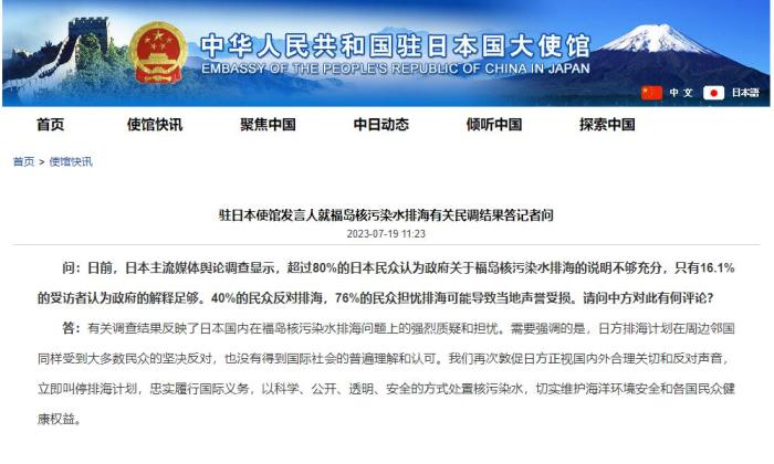 中國(guó)駐日本使館發(fā)言人就福島核污染水排海有關(guān)民調(diào)結(jié)果答問(wèn)
