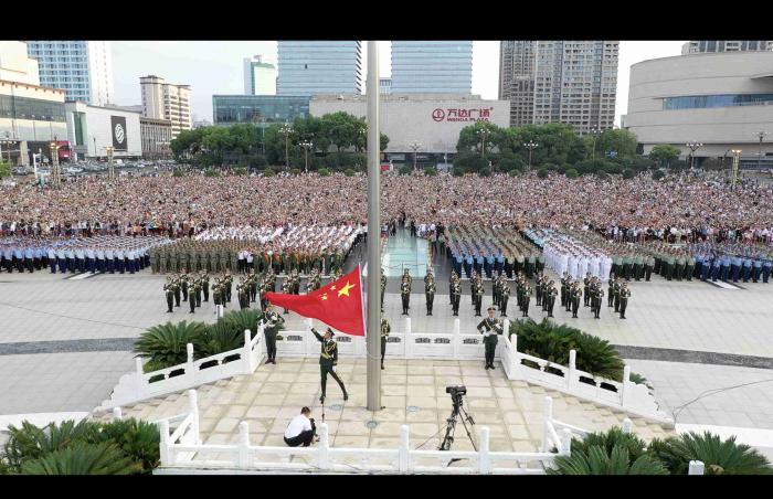 八月一號(hào)上午,全軍院?!皬?qiáng)軍杯”系列比賽集中交流賽560余名官兵與南昌市相關(guān)代表集合在南昌八一廣場(chǎng)參加升旗儀式。 劉宇龍 攝