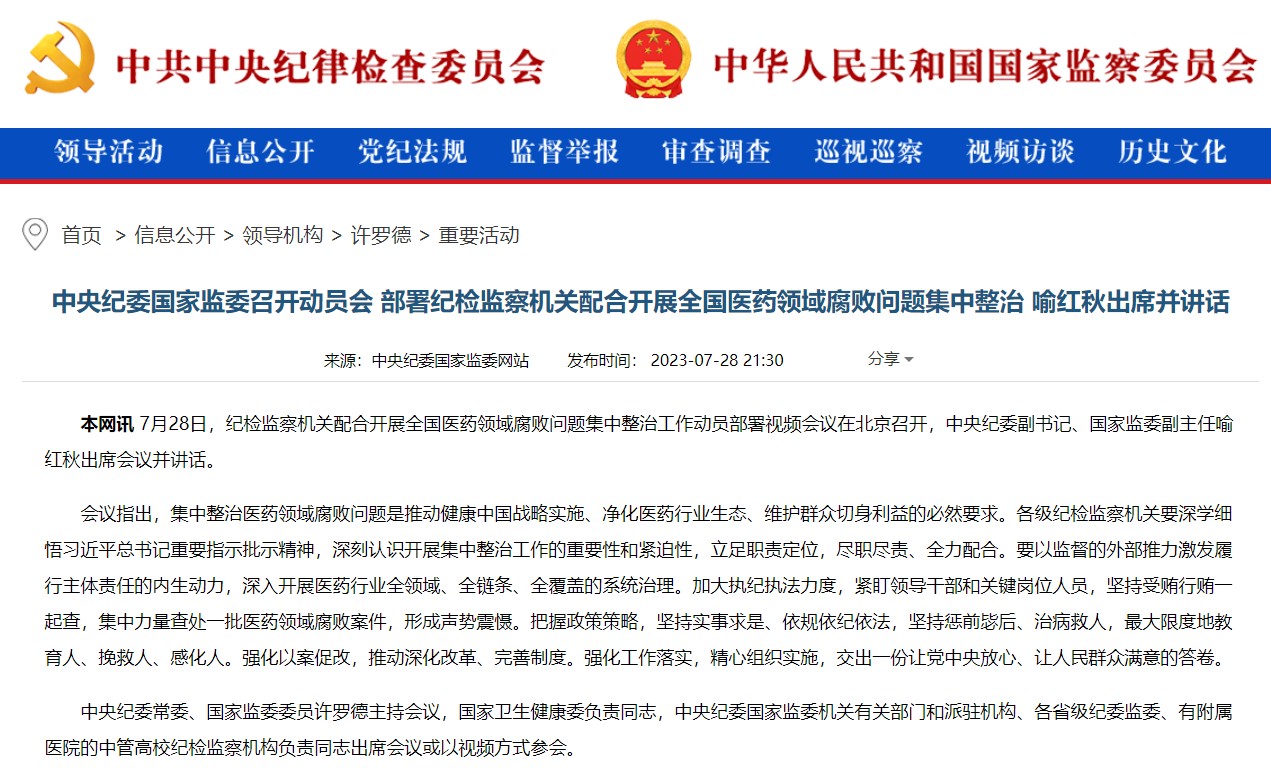 據(jù)中央紀(jì)委國(guó)家監(jiān)委網(wǎng)站消息,7月28日,紀(jì)檢監(jiān)察機(jī)關(guān)配合開展全國(guó)醫(yī)藥領(lǐng)域腐敗問題集中整治工作動(dòng)員部署視頻會(huì)議在北京召開。會(huì)議指出,集中整治醫(yī)藥領(lǐng)域腐敗問題是推動(dòng)健康中國(guó)戰(zhàn)略實(shí)施、凈化醫(yī)藥行業(yè)生態(tài)、維護(hù)群眾切身利益的必然要求。