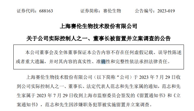 公告稱,賽倫生物實(shí)際控制人之一、董事長(zhǎng)、法定代表人范志和于2023年7月29日收到上海市監(jiān)察委員會(huì)簽發(fā)的《留置通知書》和《立案通知書》,范志和因涉嫌職務(wù)犯罪被實(shí)施留置并立案調(diào)查。