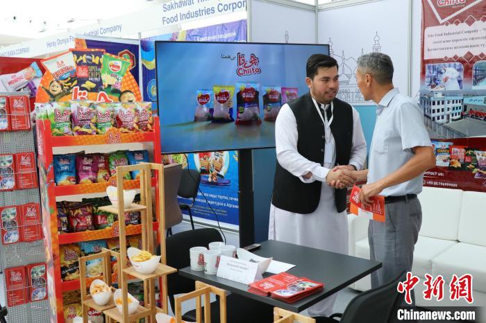 當(dāng)?shù)貢r(shí)間8月3日,哈薩克斯坦阿斯塔納,阿富汗商品展當(dāng)日啟幕。圖為阿富汗食品展商與哈顧客洽談?! ≈行戮W(wǎng)記者 張碩 攝