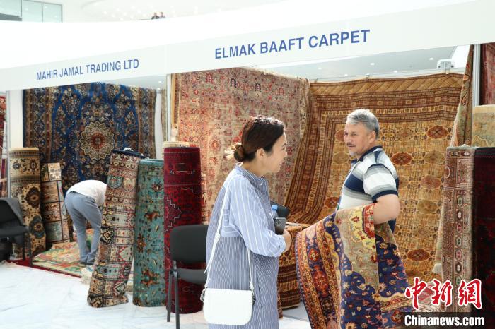 當(dāng)?shù)貢r(shí)間8月3日,哈薩克斯坦阿斯塔納,阿富汗商品展當(dāng)日啟幕。圖為展商向哈顧客展示富有阿民族風(fēng)情的手工羊毛地毯?! ≈行戮W(wǎng)記者 張碩 攝