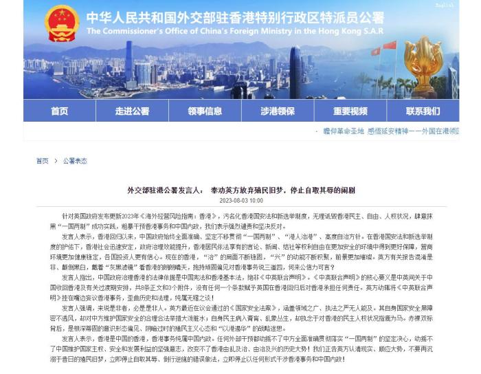發(fā)言人表示,香港是中國的香港,香港事務純屬中國內政。任何外部干預都動搖不了中方全面準確貫徹落實“一國兩制”的堅定決心,動搖不了中國維護國家主權、安全和發(fā)展利益的堅強意志,改變不了香港由亂及治、由治及興的歷史大勢!我們正告英方認清現實、順應大勢,不要再沉溺于昔日的殖民舊夢,立即停止自取其辱、倒行逆施的錯誤做法,立即停止以任何形式干涉香港事務和中國內政!