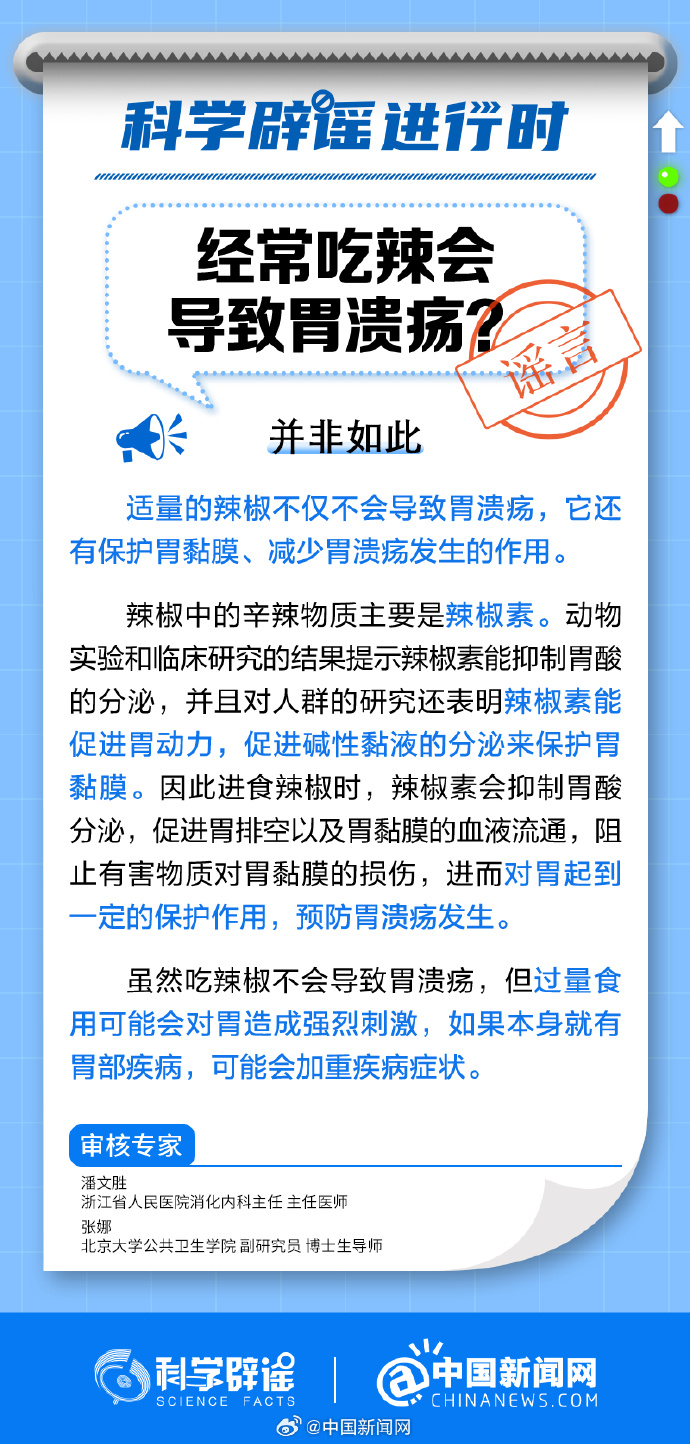 中新網(wǎng)8月23日電 適量的辣椒不僅不會導(dǎo)致胃潰瘍,它還有保護(hù)胃黏膜、減少胃潰瘍發(fā)生的作用。辣椒中的辣椒素會抑制胃酸分泌,促進(jìn)胃排空以及胃黏膜的血液流通,阻止有害物質(zhì)對胃黏膜的損傷,進(jìn)而對胃起到一定的保護(hù)作用,預(yù)防胃潰瘍發(fā)生。但過量食用辣椒可能會對胃造成強(qiáng)烈刺激,如果本身就有胃部疾病,可能會加重疾病癥狀。(來源:@科學(xué)辟謠 @中國新聞網(wǎng) )