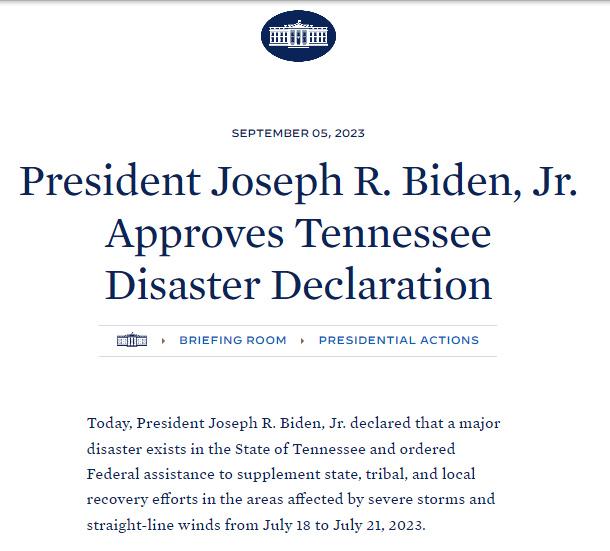 中新網(wǎng)9月6日電 據(jù)白宮官網(wǎng)消息,當?shù)貢r間9月5日,美國總統(tǒng)拜登批準田納西州重大災難聲明,并下令為田納西州從7月18日開始至7月21日期間受風暴影響的地區(qū)提供聯(lián)邦援助。