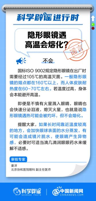 中新網(wǎng)9月20日電 吃火鍋時(shí)戴隱形眼鏡會熔化嗎?一般隱形眼鏡的熔點(diǎn)都在160℃以上,而人體皮膚耐熱度在60-70℃左右。若溫度過高,身體會本能避開高溫。即便是不慎有火星濺入眼睛,眼睛也會快速分泌淚液,熄滅火星,也就是說隱形眼鏡遇熱可能會被灼壞,但不會熔化。(來源:@科學(xué)辟謠 @中國新聞網(wǎng) )