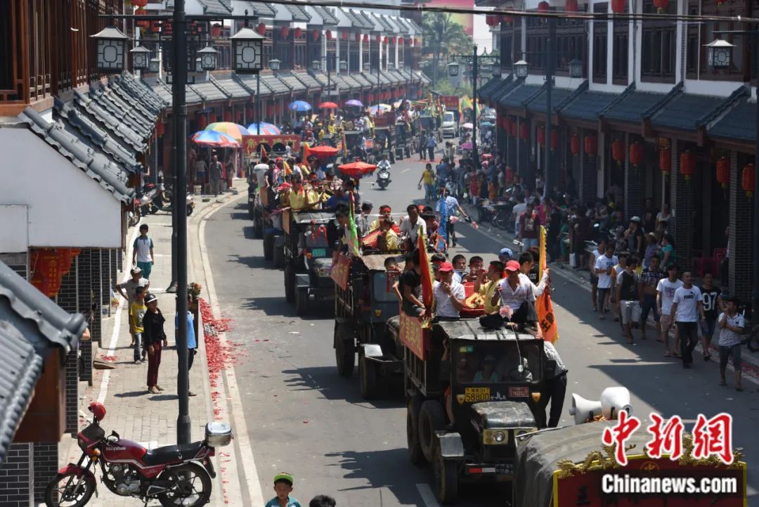 2015年4月3日,海南瓊海市萬(wàn)泉鎮(zhèn)鬧“軍坡”車隊(duì)在墟鎮(zhèn)上巡游。蒙鐘德 攝