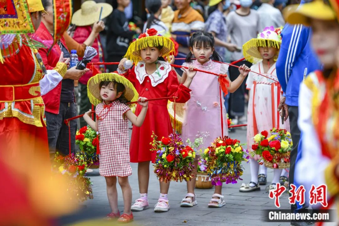 2023年2月28日,第二十二屆??谫蛉宋幕?jié)(原稱軍坡節(jié))之“裝軍巡游”活動(dòng)在海南海口新坡鎮(zhèn)舉行。圖為在活動(dòng)中肩挑花籃的小女孩。駱云飛 攝