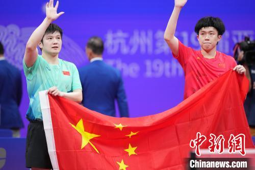 10月2日,杭州第19屆亞運會乒乓球男子單打決賽在拱墅運河體育公園體育館舉行,中國選手王楚欽4比3戰(zhàn)勝隊友樊振東,獲得冠軍。圖為王楚欽(右)與樊振東在賽后手持國旗向觀眾致意。 中新社記者 田博川 攝