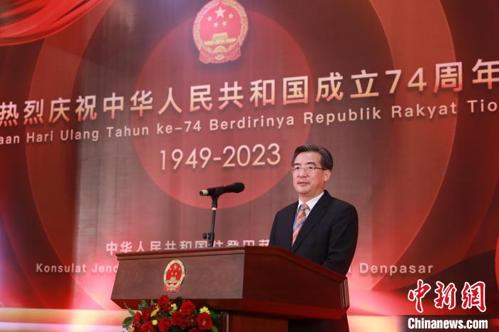 中新網(wǎng)登巴薩10月13日電 (記者 李志全 實習(xí)生 陳詩夢)10月12日晚,中國駐登巴薩總領(lǐng)館舉辦招待會,熱烈慶祝中華人民共和國成立74周年。中國駐登巴薩總領(lǐng)事朱興龍出席并致辭。巴厘省省長代表蘇拉加、旅游局局長巴古斯、伍拉萊移民局局長蘇亨德拉、交通局局長葛德、文化局局長阿亞等政要,宗教、行業(yè)協(xié)會、外國駐巴厘島總領(lǐng)事等各界友人以及中資企業(yè)、華僑華人、漢語教師代表等300余人出席。