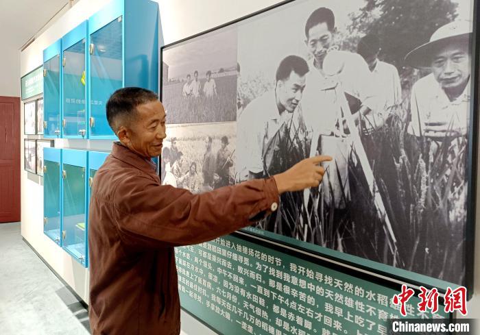 10月13日,在安江農(nóng)校紀(jì)念園內(nèi)的雜交水稻發(fā)源地紀(jì)念館,袁隆平的學(xué)生宋澤觀(guān)講述袁隆平及其團(tuán)隊(duì)研究雜交水稻的故事。中新社記者 鄧霞 攝