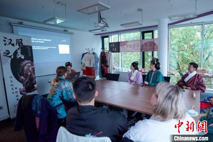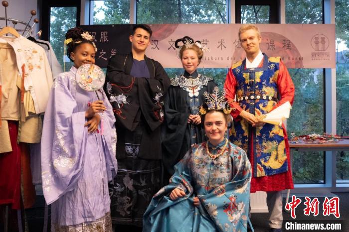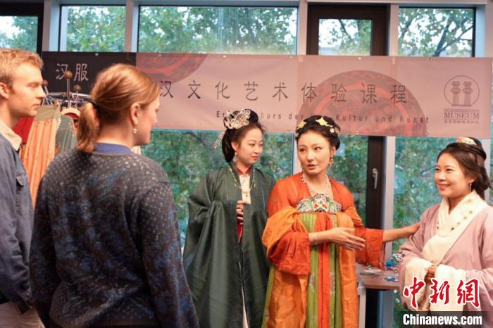 圖為德國(guó)學(xué)生身著漢服參與漢文化體驗(yàn)課程,學(xué)習(xí)漢服文化。漢文化藝術(shù)交流中心供圖
