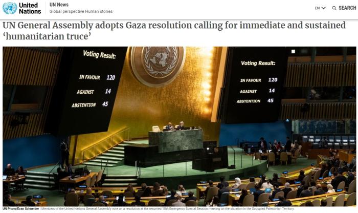 據(jù)聯(lián)合國網(wǎng)站消息,紐約當(dāng)?shù)貢r(shí)間27日下午,第78屆聯(lián)大以125票贊成、14票反對(duì)和45票棄權(quán)的表決結(jié)果,通過了由約旦代表阿拉伯國家集團(tuán)提交的一份聯(lián)大決議草案。