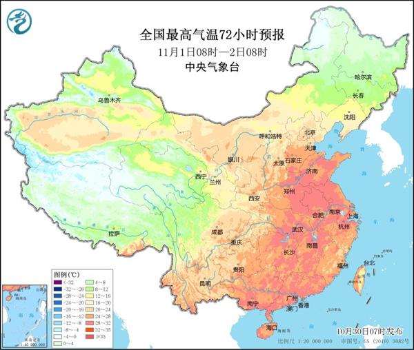 本周前期,中東部升溫還將繼續(xù)。 預(yù)計本周初,全國大部仍會以升溫為主,并且大幅偏離常態(tài)。特別是華北、黃淮一帶,11月初暖熱程度還會升級,部分地區(qū)最高氣溫甚至?xí)^30℃部分,比如,鄭州,菏澤等地可能在11月1日前后迎來當(dāng)?shù)?1月觀測史上的首個30℃。