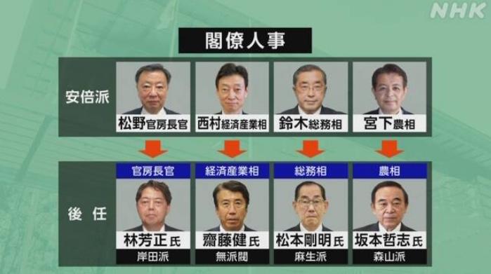 據(jù)報(bào)道,岸田將會(huì)把官房長(zhǎng)官、經(jīng)產(chǎn)相、總務(wù)相和農(nóng)相四個(gè)重要職位換人,此前任外相的林芳正將接替松野博一擔(dān)任官房長(zhǎng)官,經(jīng)產(chǎn)相、總務(wù)相和農(nóng)相將分別由齋藤健、松本剛明和坂本哲志擔(dān)任。四人均不屬于安倍派成員。